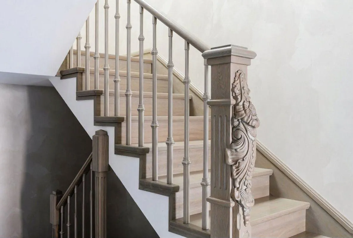 Надежность этой лестницы заложена в самом ее основании. Монолитный бетонный каркас полностью исключает любые скрипы или вибрации, делая каждый шаг по ней абсолютно бесшумным и уверенным. Широкий дубовый поручень обеспечивает удобный и безопасный хват, а часто расположенные резные балясины служат надежной защитой для самых маленьких членов семьи, превращая красивый элемент в гарантию спокойствия.